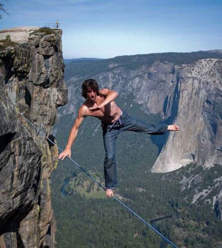 Đây là Dean Potter đang đi bộ trên một sợi dây thừng, hàng ngh́n mét trên không, trong Công viên Quốc gia Yosemite