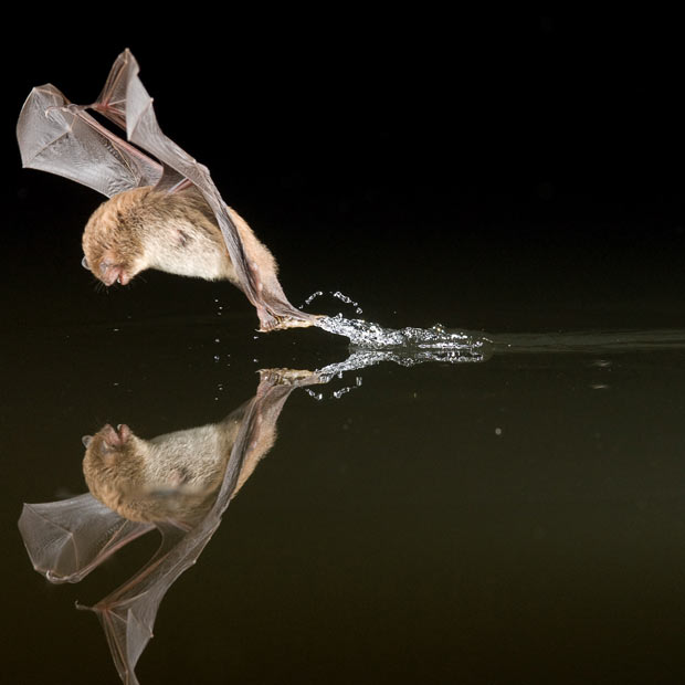Hình ảnh một con dơi vồ mồi soi bóng xuống nước tại một