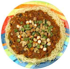 muỗng canh nước tương - 2 lọ nhỏ (8 oz.) xốt cà chua spaghetti Cách Làm: - Mì spaghetti: nấu nước sôi, cho mì vô luộc khoảng 10 phút. Vớt ra, rửa nước lạnh cho sạch nhớt. Trộn đều với dầu canola hoặc bơ cho thơm và bóng. - Ðặt nồi lên bếp, cho vào 5 muỗng canh nước và ớt Đà Lạt. Khi nước sôi, đổ ra tô. - Cho dầu canola vào. Xào gà chay, tôm chay, và "ham" chay cho hơi cháy. - Cho các loại nấm và ớt Đà Lạt vào xào tiếp. Sau cùng cho khoảng 5 muỗng canh nước vào. - Khi vừa chín, cho nước tương và xốt ragu vào, khuấy đều. Ðậy vung và hạ nhỏ lửa. Ghi chú: Món này rất hợp khẩu vị cho những vị trẻ tuổi, vừa tiện và vừa đơn giản. |