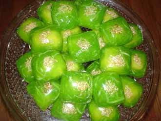 Bột: 1 gói bột năng (14oz) 4 1/4 cups nước 1/2 gói dừa nạo sợi mua sẵn (frozen) 1 1/2 cups đường 1 1/2 tsps màu xanh 1/2 tsp nước lá dứa trong chai mua sẵn 1 tsp hàn the or 1g bột an toàn (bột thay thế hàn the) Mè rang để cho lên trên mặt Cách Làm: Trộn tất cả, cho lên bếp khuấy cho bột đặc thành 1 miếng to, bột không cần chín hoàn toàn. Bỏ ra cắt thành miếng nhỏ, nhận nhân vào giữa và túm lại, chấm mè rang lên trên rồi gói bằng plastic wrap, ấn hai bên cho thành hình như trên, mang đi hấp lại 10-15 phút. Nếu chưa ăn ngay có thể bỏ vào freezer, khi nào ăn mang ra hấp lại 25 phút (thẳng từ freezer vào xửng hấp). *** Nếu muốn bánh mầu vàng thì cho phẩm vàng vào thay vì nước lá dứa và mầu xanh. Bánh Xu Xê có thể có đủ nhiều mầu: xanh, vàng, trắng, tím... |