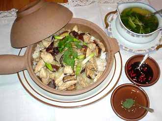 phút cho thấm. Rồi cho 1/2 phần gà xào còn lại lên trên là xong.