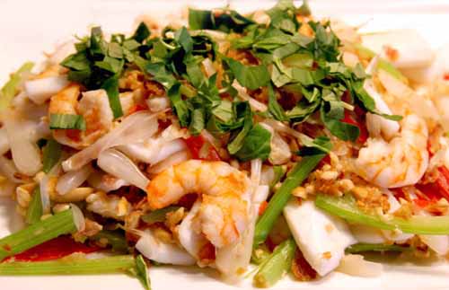 Mực nang cắt miếng vừa ăn, nếu kẻ hoa được càng tốt. Trụng sơ, đừng trựng lâu quá mực dai không ngon. Tôm luộc sơ vào nước sôi, thấy tôm đổi màu là được. Luộc xong lột vỏ, như vậy con tôm được thẳng không bị xoắn lại. Cắt ớt thành sợi dài, bỏ hột. Cắt củ kiệu cho mỏng. Cho tất cả vào tô gồm có: mực, tôm, ớt, cần tàu, hành phi, củ kiệu, dấm, chút xíu nuóc mắm, tiêu, đường, và chút dầu ăn. Cho gỏi ra đĩa, rắc đậu phọng và rau thơm. Gỏi này có thể ăn kèm với bánh phồng tôm chiên. |
