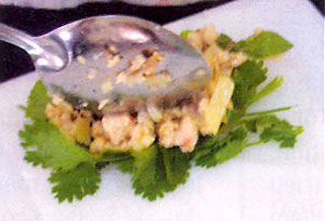 khoảng 5 phút. Gà lọc bỏ xương, da, bằm nhỏ, ướp với hạt nêm khoảng 5 phút.